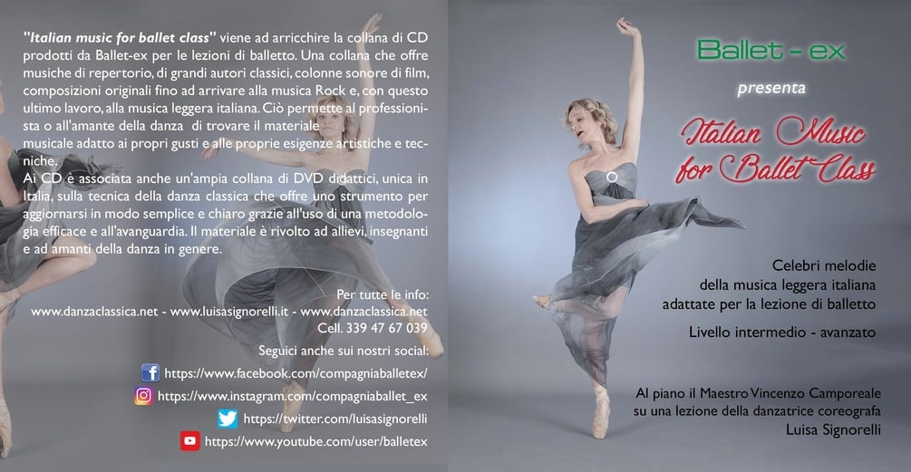 Track n 13 of the second cd from the album "Italian music for ballet class" a work born from the desire to experiment with new expressive possibilities through the great stylistic and melodic variety of Italian pop music. The pieces were arranged by Maestro Vincenzo Camporeale under the guidance of the dancer, choreographer and teacher Luisa Signorelli, and give the ballet lesson a fresh and original momentum.